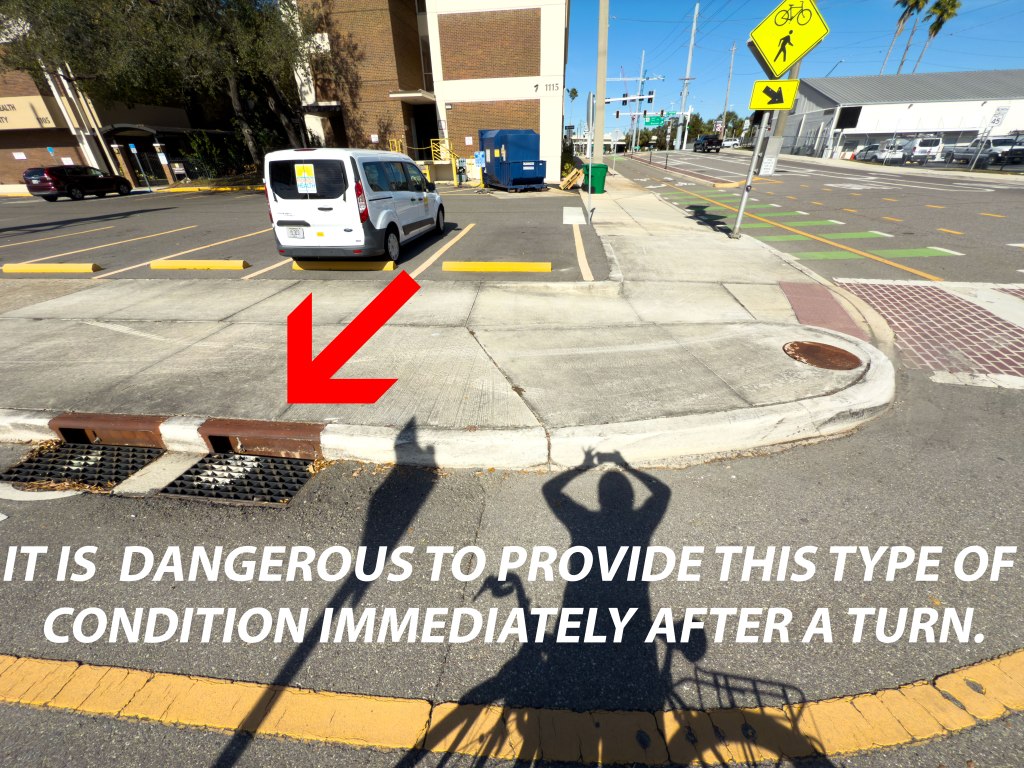 We don’t hate cycle tracks, we just hate bad design and negligence. We understand you need drainage in Tampa but we don’t understand why choose the worst drainage design and place that right after a turn.