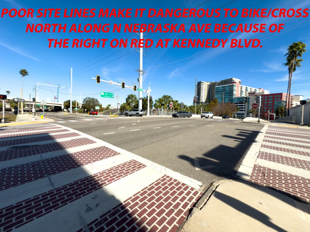 While it does not look bad, this intersection is actually raised a bit for Florida standards. This wonky elevation makes visibility difficult to gauge traffic ascending up along Nebraska and Kennedy (from Channelside).