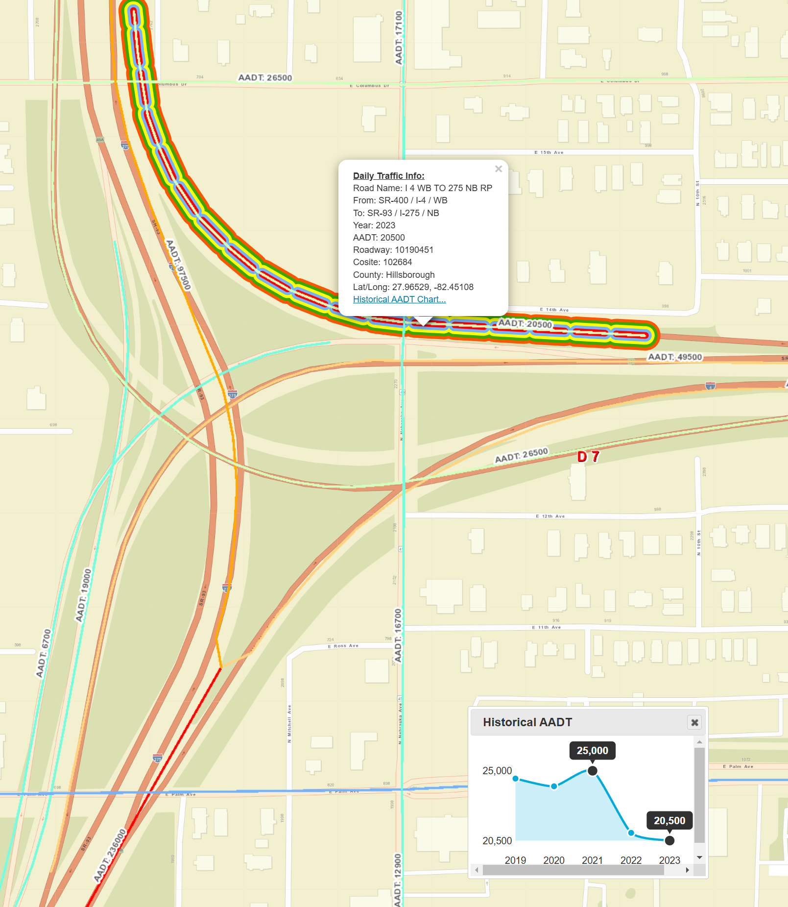 Some traffic at this controversial interchange (some areas are elevated but only to prior years-not exceeding) has been trending down since 2021 as FDOT traffic counts verify below.