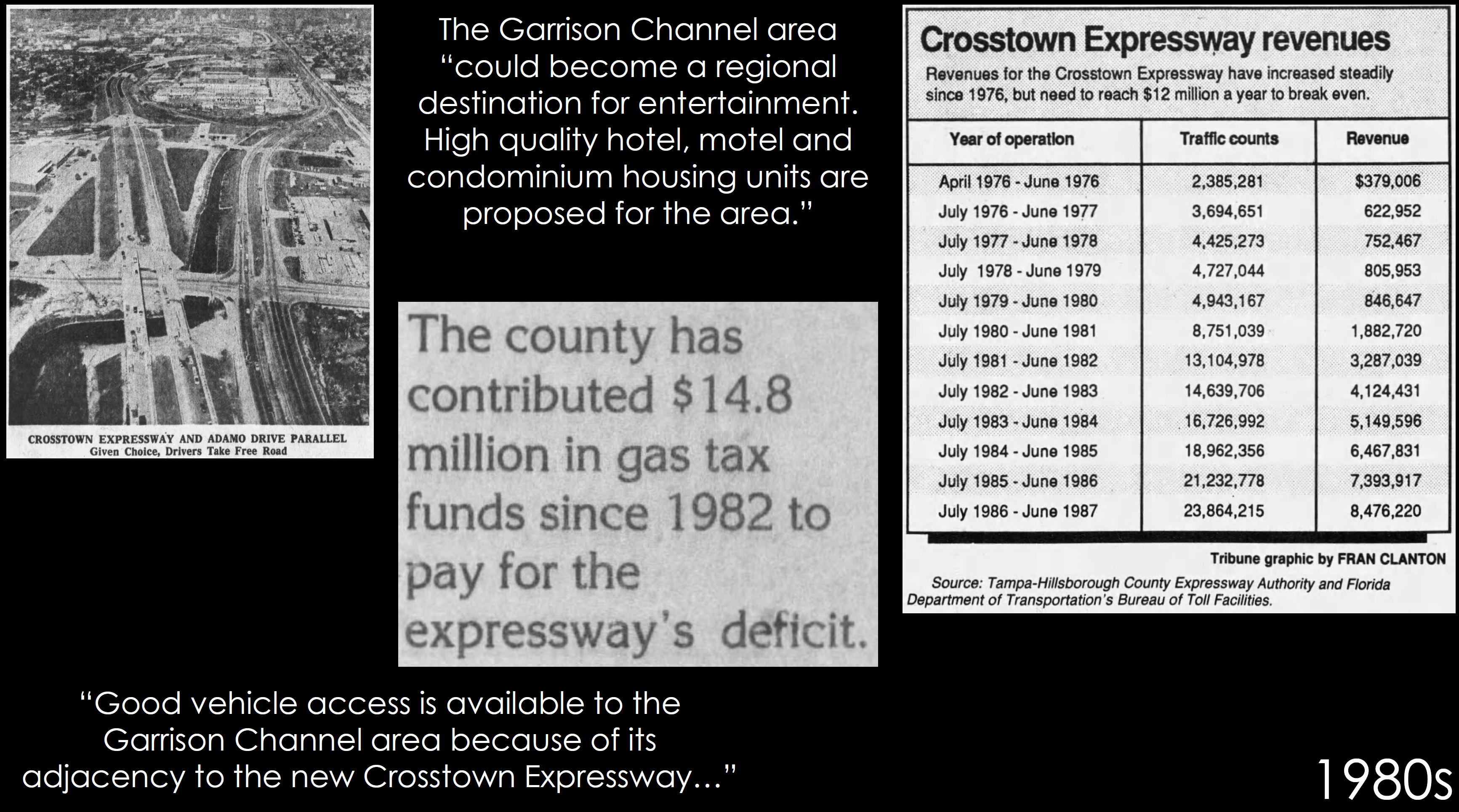 Below is a presentation we did for the TPO in regards with a tolled highway called the Crosstown. In the 1960s, planners thought by 1980 we would have over 500,000 people in Tampa. We just broke 400,000 in our population size forty five years later from 1980.